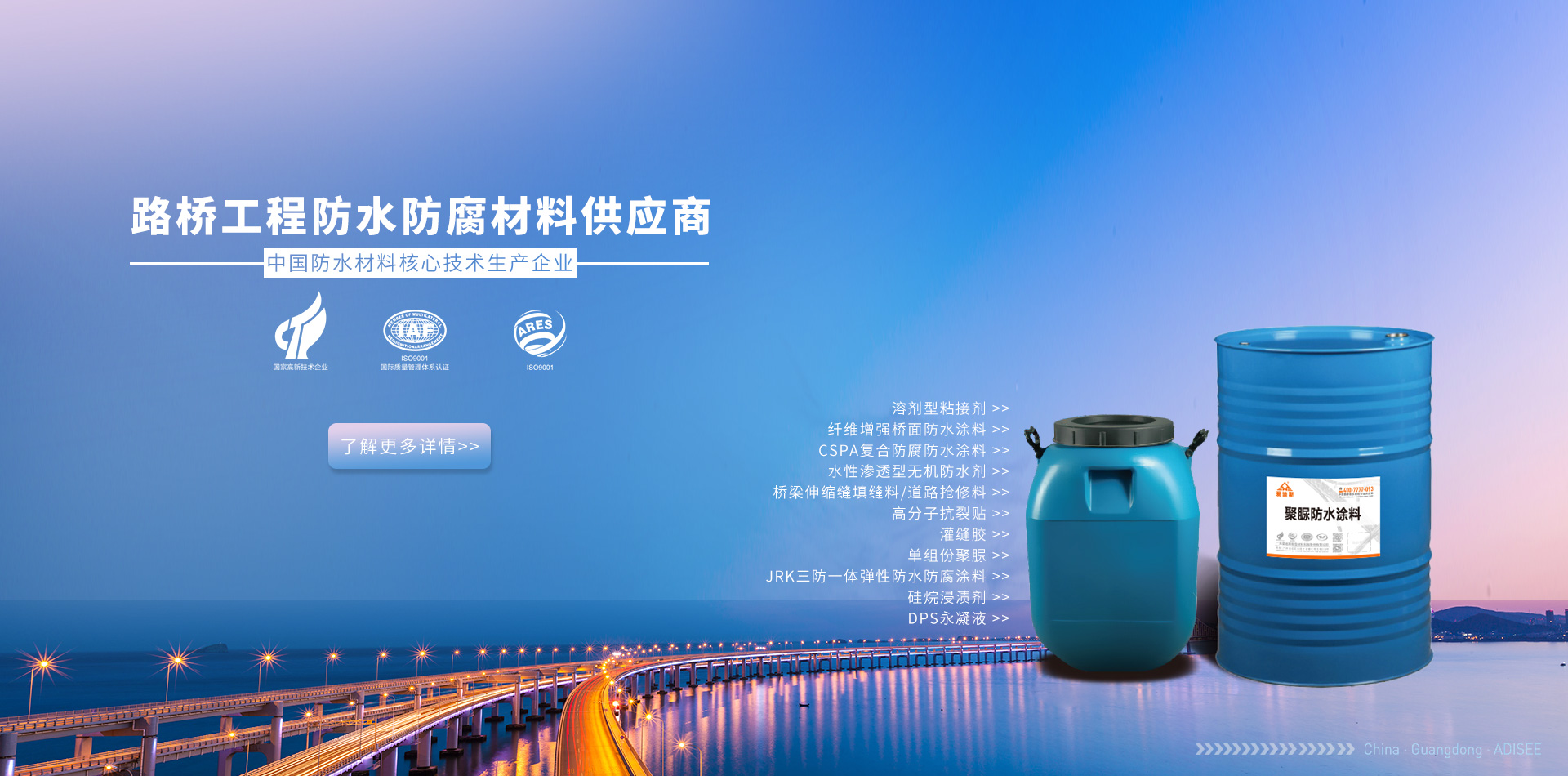 廣東愛迪斯新型材料科技有限公司廣州分公司 隔音隔熱系列 路橋及防腐防水系列 家裝工程防水系列 修繕補漏防水系列專業(yè)承接路橋防水防腐工程施工及防水材料銷售,路橋防水工程遍布全國各地,多年的技術經(jīng)驗積累了一整套橋面防水病害處理方案,專業(yè)的路橋防水技術,配套路橋防水施工設備,圓滿完成路橋防水施工任務,用戶滿意度評價高,處橋梁防水行業(yè)技術領先水...